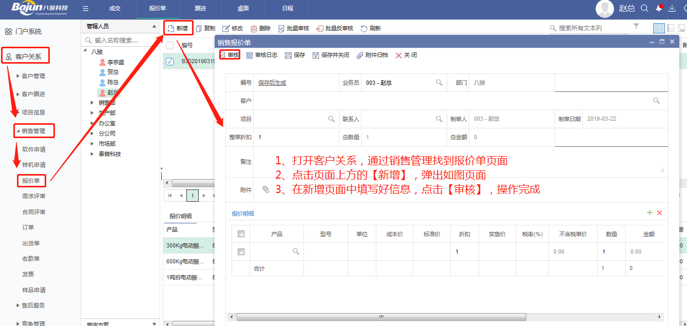 1、打開客戶關系,通過銷售管理找到報價單頁面