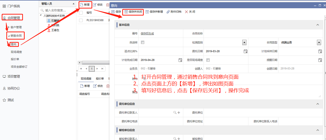 3、在合同新增頁面填寫好信息,點擊【保存并關閉】,操作完成
