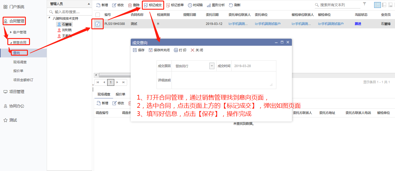 2、選中合同,點擊頁面上方的【標記成交】,彈出如圖頁面