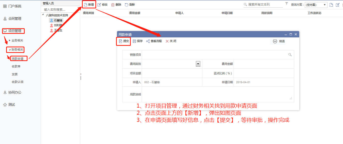 1、打開項目管理,通過財務相關找到用款申請頁面