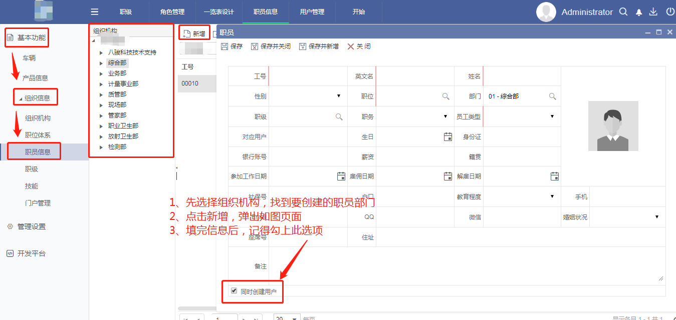 3、填寫職員信息,同時,記得勾選【同時創建用戶】