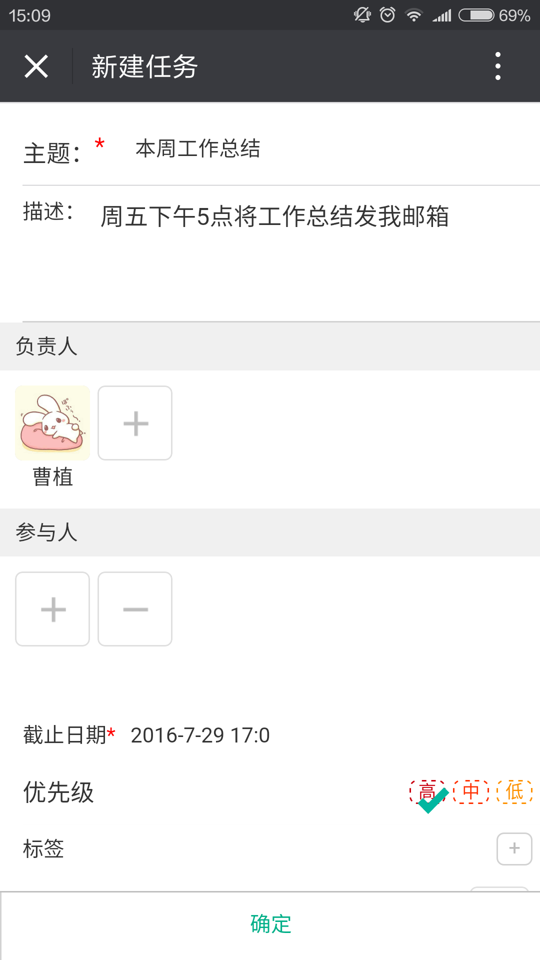 為任務指定參與人,設置工期、優先級,還可添加標簽及附件,任務創建人默認為任務負責人,需要選擇其他負責人可點擊進入通訊錄中選擇,任務負責人只能選擇一人。