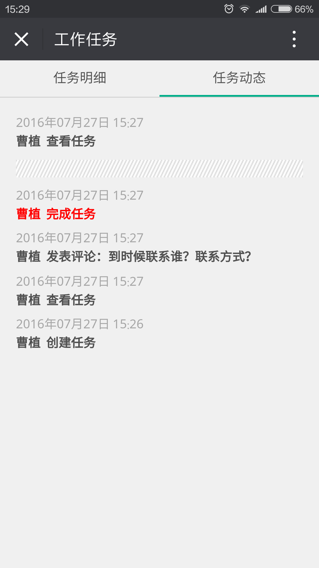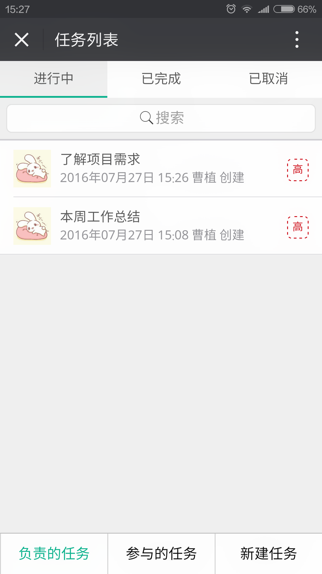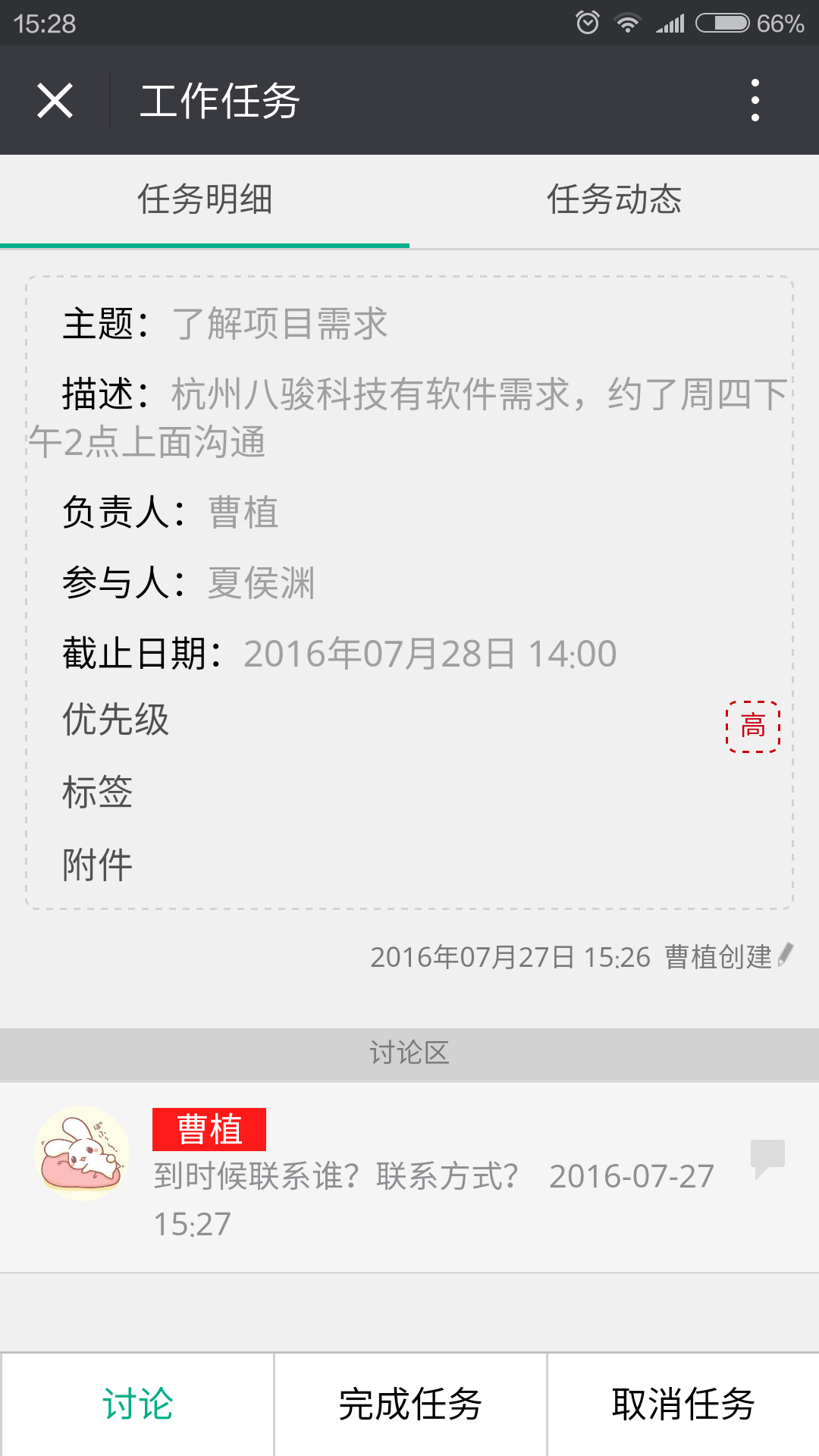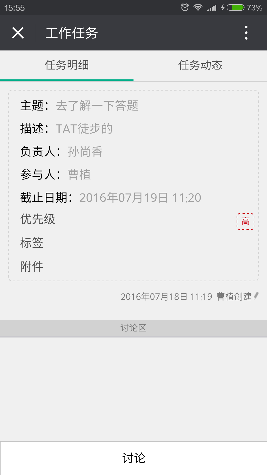 點擊“參與的任務”可以看到你參與的任務,并可查看該任務的進展狀態,分別有“進行中”、“已完成”及“已取消”。點擊任務項還可查看任務明細與任務動態,并支持對任務進行討論。
