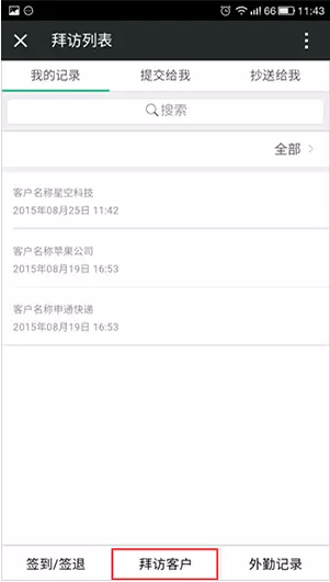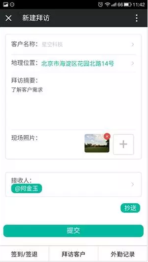 點擊“新建拜訪”,輸入客戶信息,填寫拜訪摘要,選擇拜訪信息接收人,點擊“提交”,領導即刻就能接收到該拜訪信息。點擊“拜訪記錄”,可以實時查看自己過往的拜訪歷史,有效管理目標客戶。