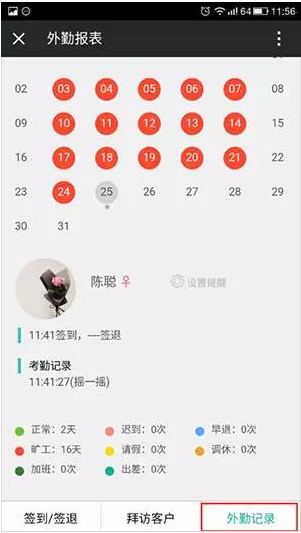 點擊“外勤記錄”可以查看每月的考勤明細,每個考勤事項均已用不同顏色加以標識。